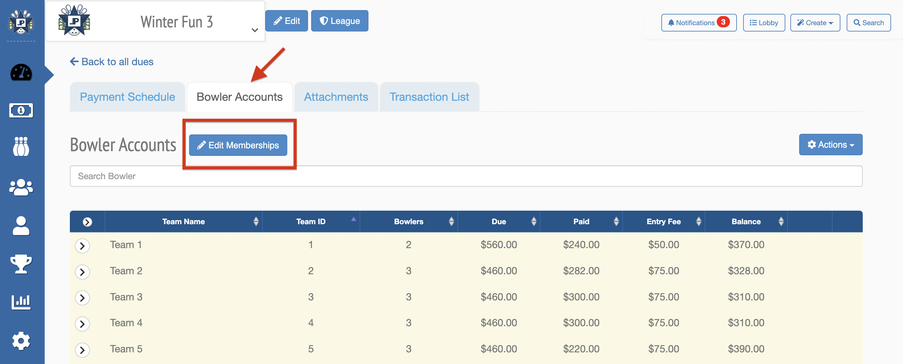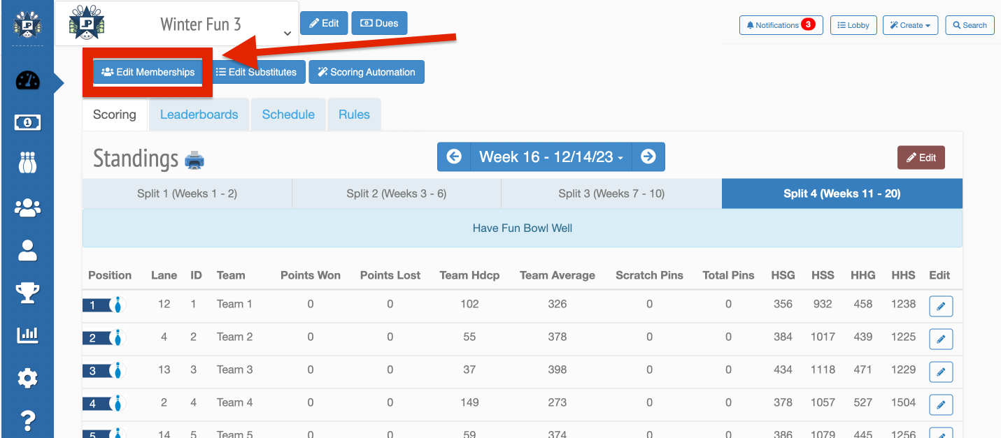 2. Can review when bowlers have bowled and for which dates will be charged under Edit Memberships