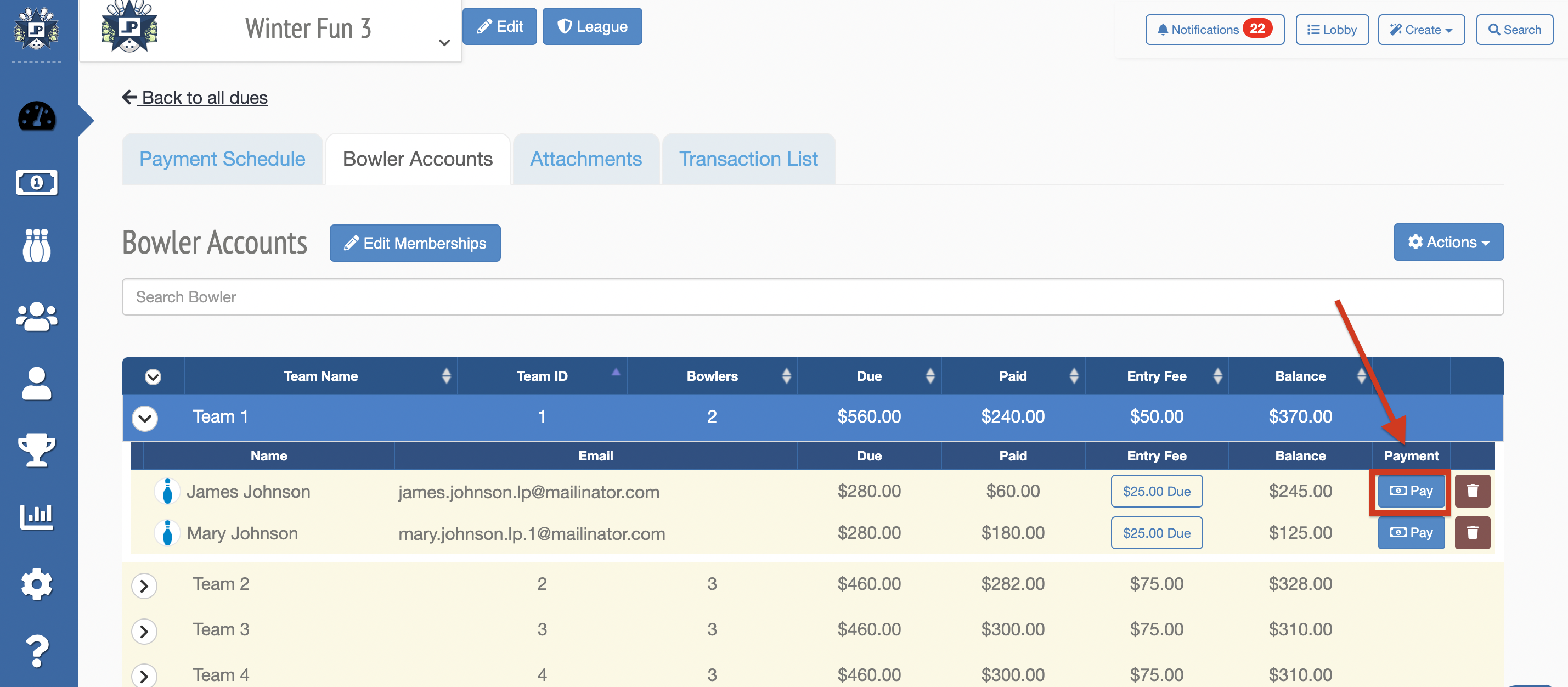 3. Click on the Bowler Accounts tab and then find the team for the bowler and click on the arrow to the left of the team name to show the bowlers on the team. Then you can hit the pay button on the right side of the page.