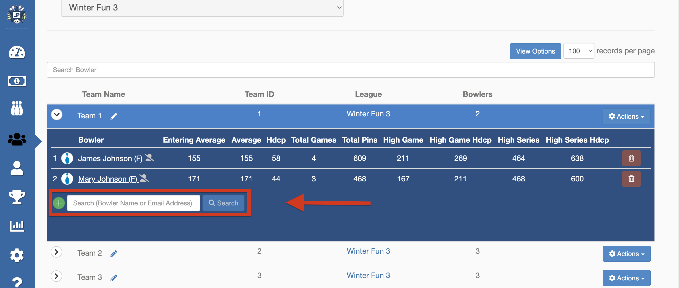 3. In the Search field under the team’s list of bowlers, type the bowler’s name you wish to add. Repeat for every bowler that needs to be added to this team.