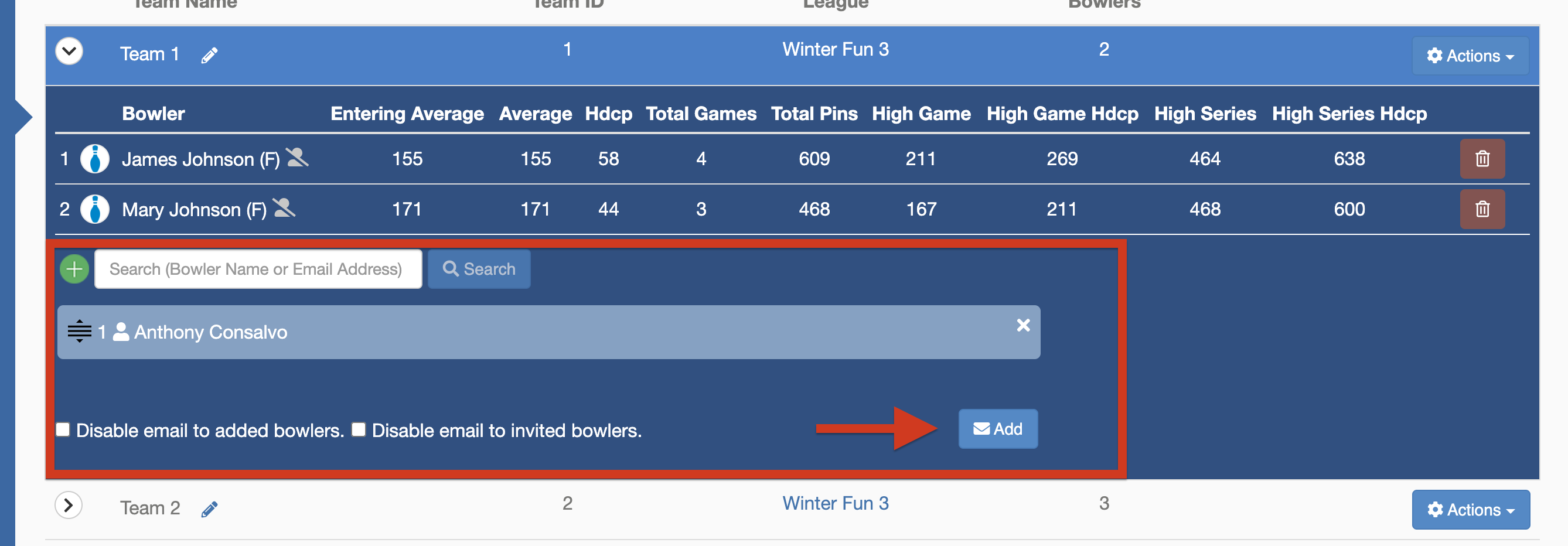 5. Then click the Add button to confirm adding the bowlers in the blue bubbles to the team.